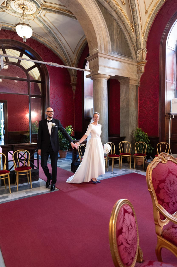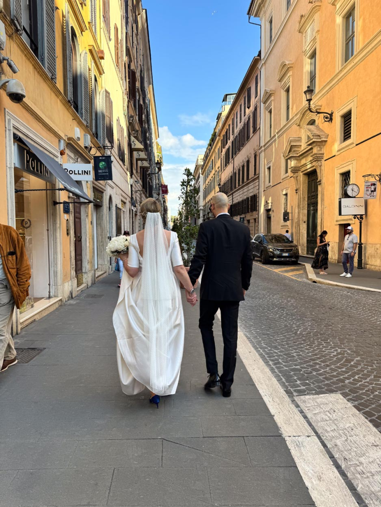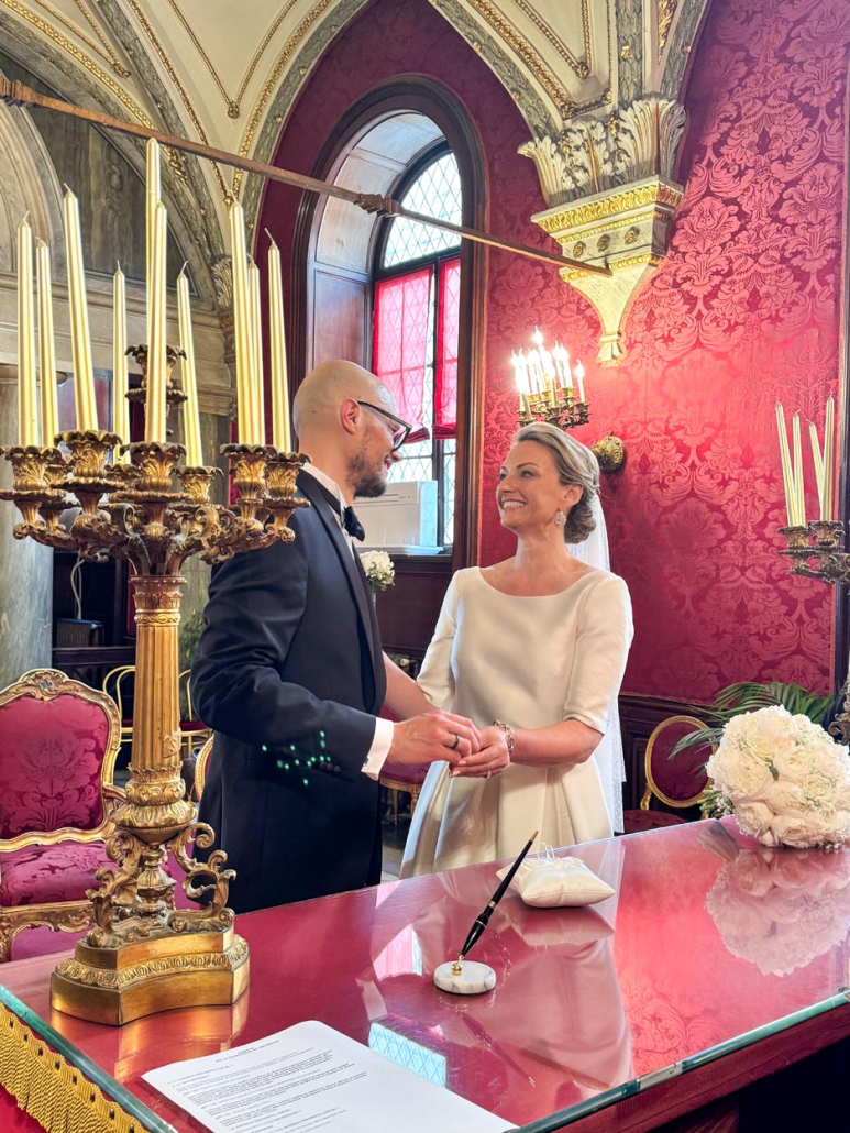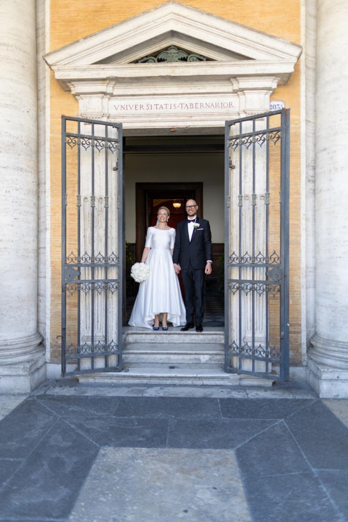 Tre brudepar ble viet denne fredagen. Et italiensk par, et gresk og et norsk par. Alle i tur inn i flotte Sala Rosa ved Piazza Campidoglio, like ved mektige Forum Romanum og Monumento a Vittorio Emanuele. Selve vielsen varte i 20 minutter. Brudeparet valgte klassisk italiensk musikk som inngang til seremonien, og de kom inn i seremonirommet hånd i hånd sammen, mens forlovere og seremonimester ventet inne ved vielsesbordet. Rommet var stort, høyt under taket og majestetisk utsmykket med klassisk italienske bueganger og vakre møbler i fargene rødt og gull. Seremonimesteren talte på italiensk, og hun gikk gjennom tre italienske lover som omhandlet familie, omsorg for hverandre og likestilling. Takket være norsk tolk fikk brudeparet og forloverne med seg alt som ble sagt. De gav hverandre sine ja både på både norsk og italiensk, og ble formelt gift etter italiensk lov med forhåndsgodkjenning av den norske stat.
