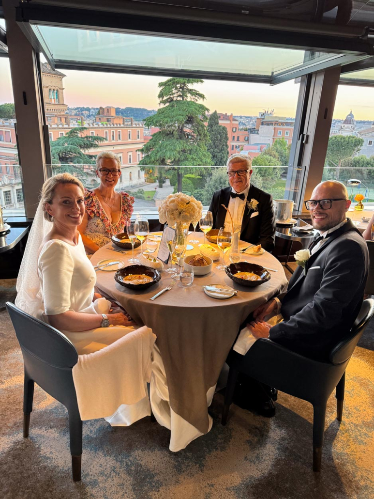 Bryllupsmiddagen ble holdt i panoramarestauranten på Hotel Eden, La Terazza. En kjent og velrennomert restaurant i Roma. Åtte flinke kelnere og en meget god sommelier sørget for en fantastisk 12-retters middag med nydelige vinvalg tilpasset de 12 rettene.