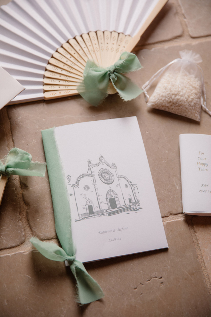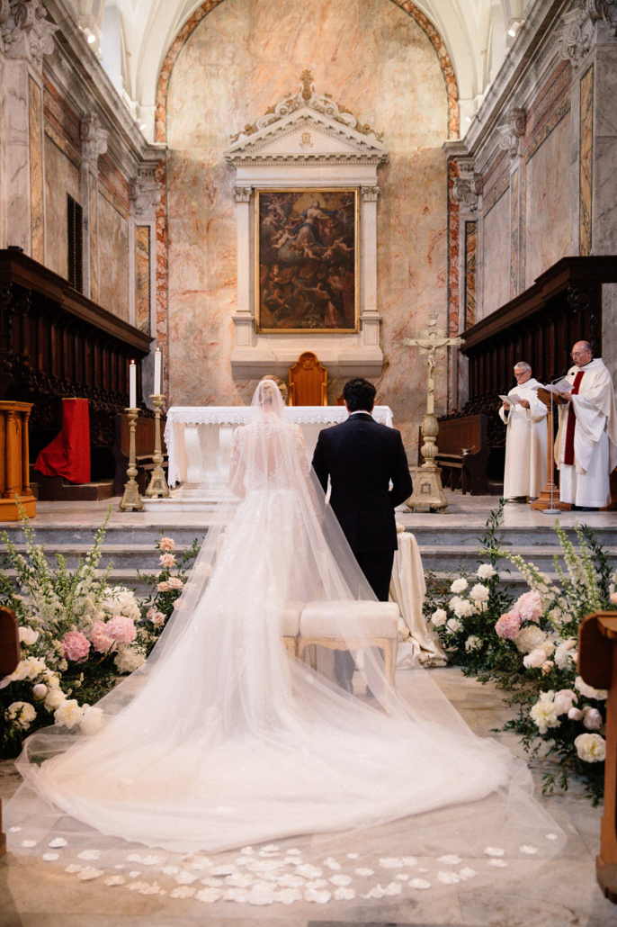 Vielsen var katolsk, og for å gjøre opplevelsen enda mer personlig, hadde jeg laget et kirkeprogram til alle gjestene. For de norske gjestene oversatte jeg hele vielsen til norsk, slik at de kunne følge med på hva som ble sagt. Da vi ga våre løfter, ba jeg presten om tillatelse til å uttale dem både på norsk og italiensk, noe som ga våre løfter en ekstra romantisk og intim følelse.