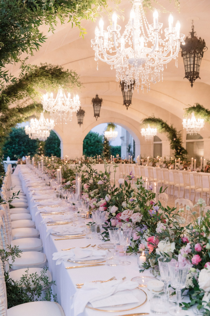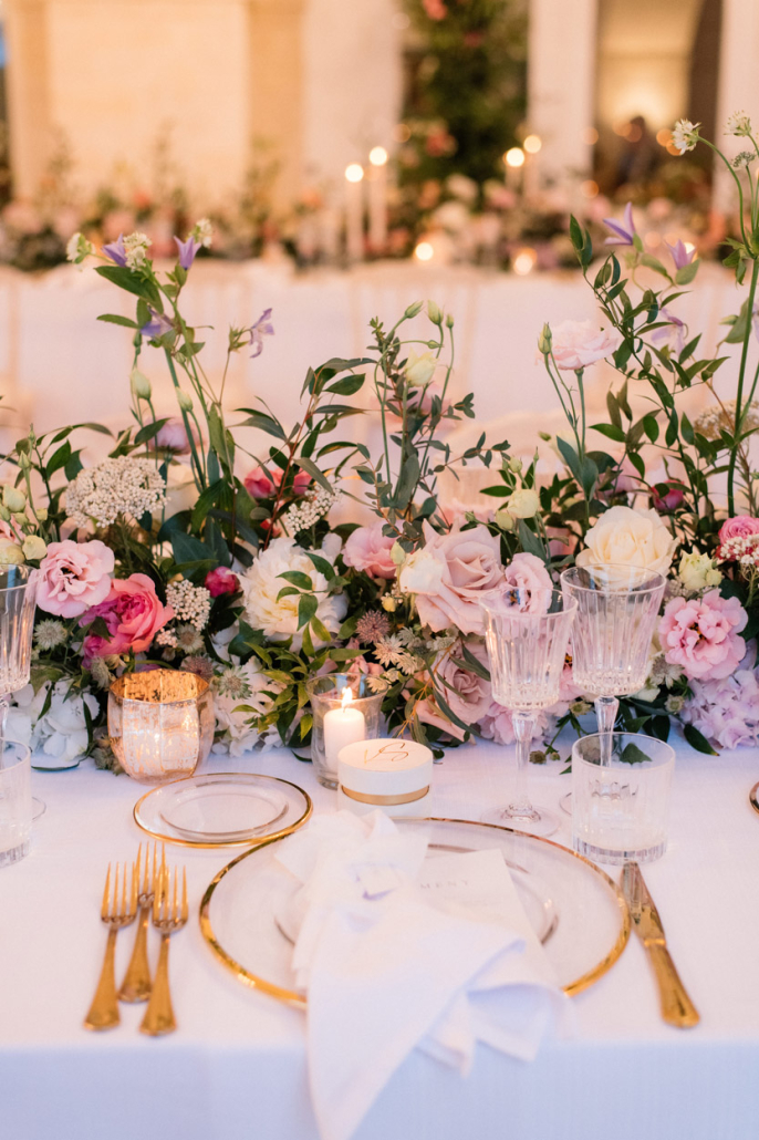 Etter frieriet startet vi planleggingen av de tre dagene, og jeg laget et mood board for å samle inspirasjon. Sammen med blomsterleverandøren skapte vi en romantisk stil med en fargepalett som besto av krem, hvitt, babyrosa, rosa, lilla, fuksia og ulike grønntoner for å gi bryllupsdagen et harmonisk preg.