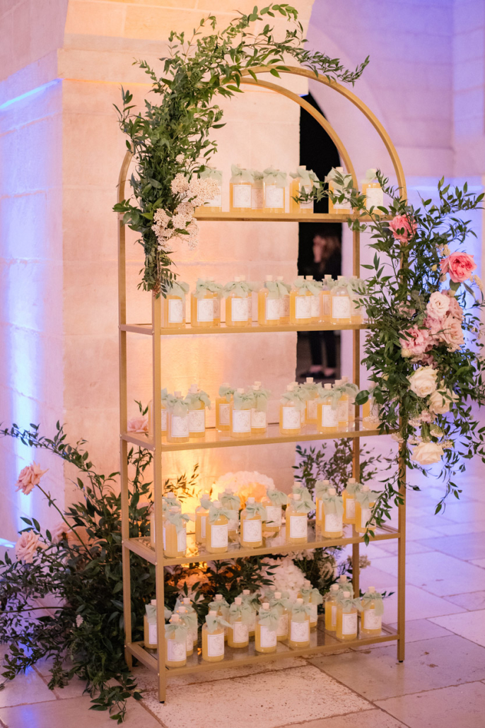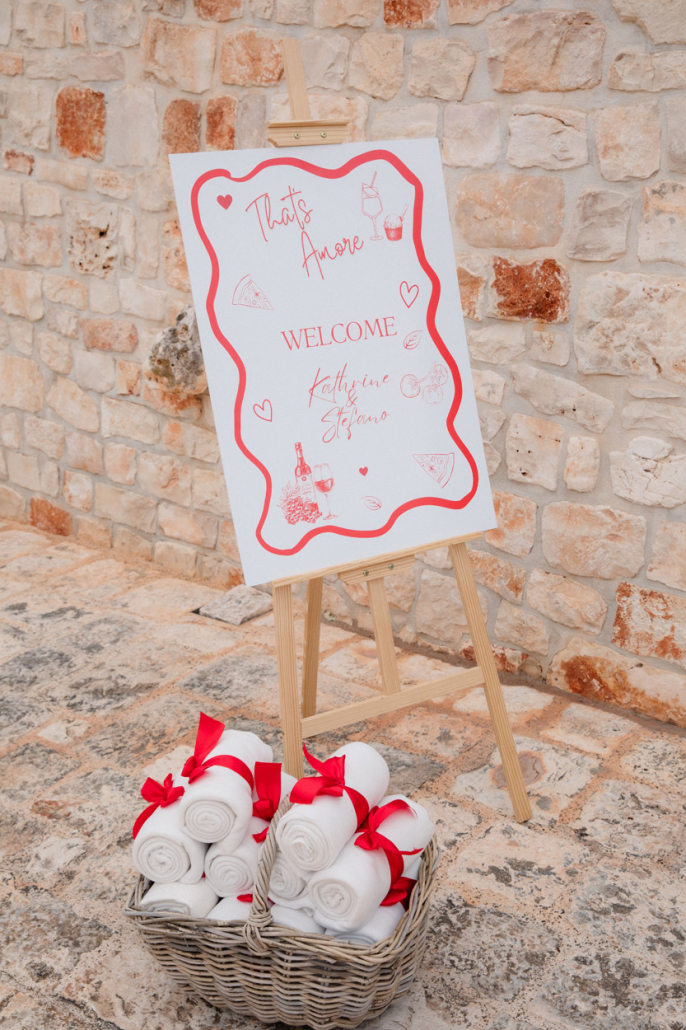 Til velkomstfesten fikk hver gjest en personlig velkomstbag fylt med vannflaske, taralli (tradisjonelle italienske snacks), sukkertøy og et program for feiringen. På bordene lå det en tamburello med vår logo på til hver gjest, som ble flittig brukt under kvelden. Alt var nøye gjennomtenkt og skreddersydd med våre initialer – til og med iskoppene hadde vår logo trykket på.