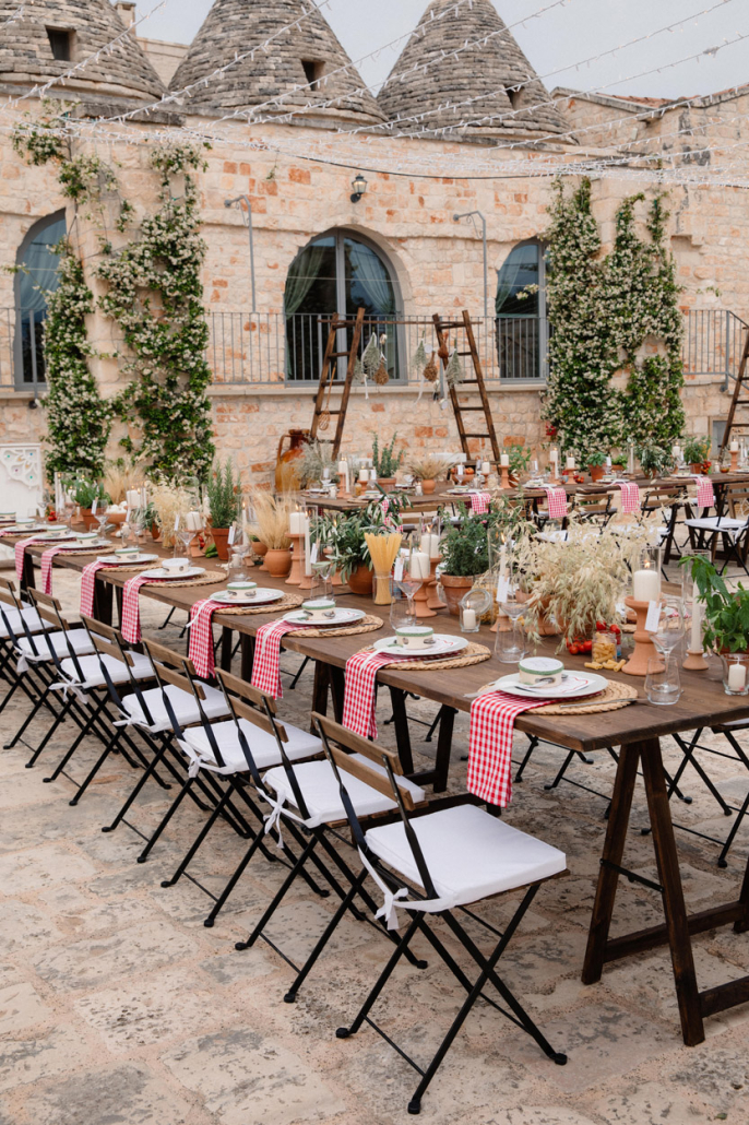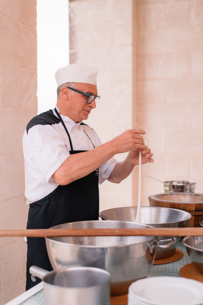 Masseria er en tradisjonell gårdseiendom fra 1500- eller 1600-tallet, opprinnelig brukt som en selvforsynt jordbruksenhet. Disse historiske eiendommene er spredt rundt Puglias pittoreske landskap, omgitt av olivenlunder, vingårder og små, idylliske landsbyer. Masseriaens rustikke sjarm og historie gjorde det til et perfekt sted for vår fest – et sted som virkelig ga gjestene våre et glimt av Puglias sjel.