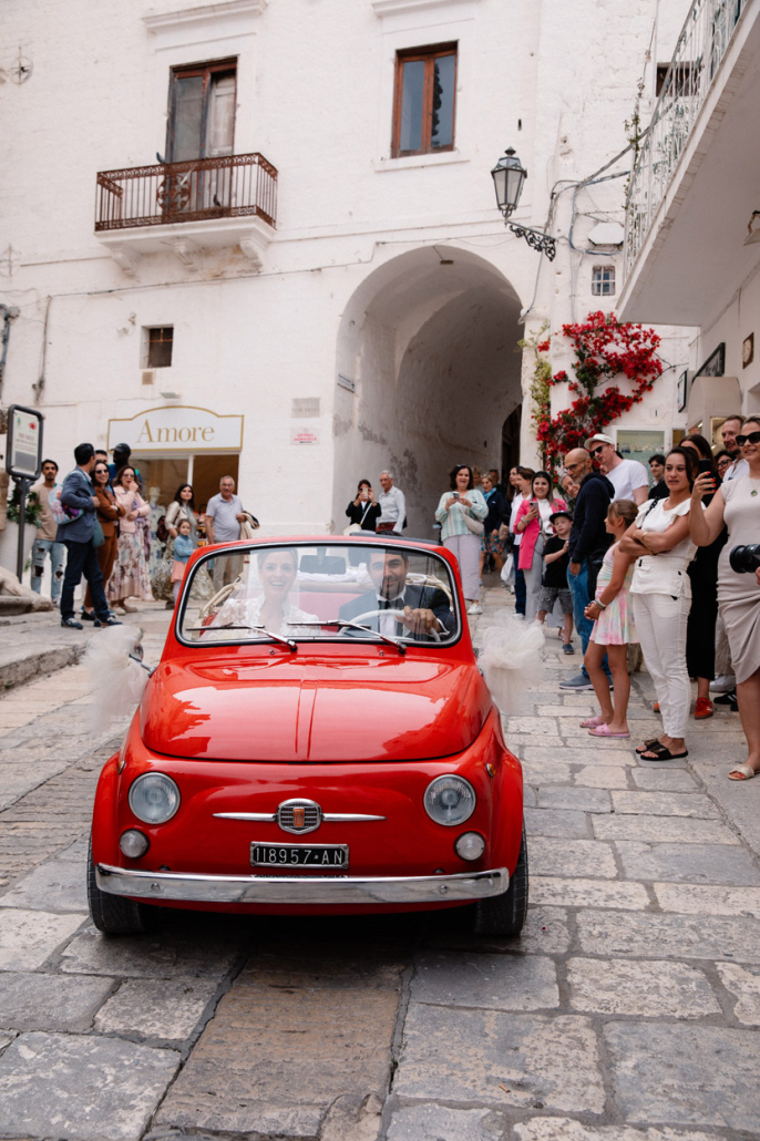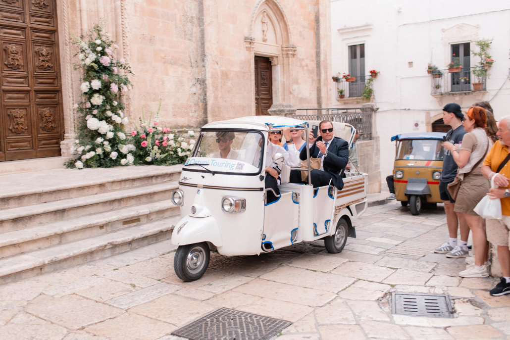Vi giftet oss i den vakre katedralen i Ostuni. Gjestene våre ble fraktet til sentrum av Ostuni, hvor vi så hadde booket små apebiler (tuktuks) som tok dem videre til kirken.