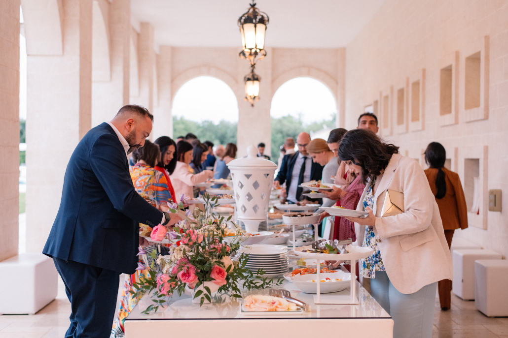 På bryllupsdagen ble gjestene møtt med en aperitiffbuffet fylt med en rekke delikatesser, inkludert fisk, kjøtt og fersk mozzarella som ble laget live for å gi en ekstra touch av magi.