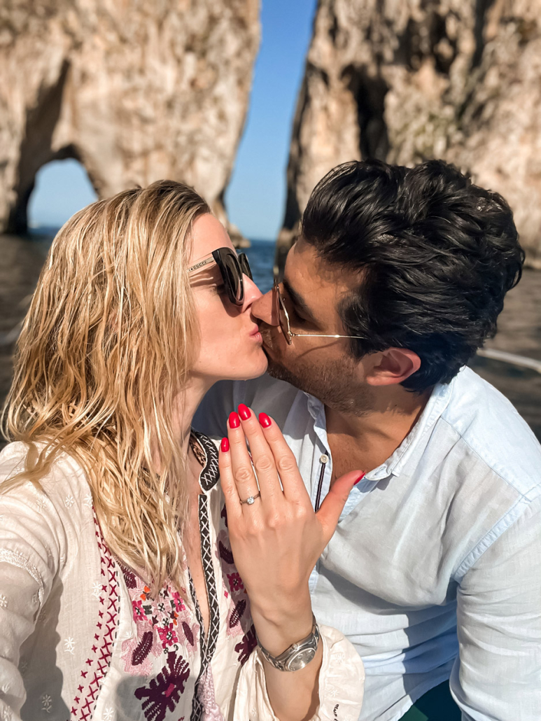 Da vi nærmet oss de ikoniske Faraglioni-klippene, gikk han plutselig ned på kne og fridde! Overveldet av lykke svarte jeg selvfølgelig med et stort JA. For å feire øyeblikket åpnet vi en flaske prosecco og skålte for fremtiden vår sammen. Båten tok oss under den midterste buen til klippene, kjent som ”Arco dell’Amore” (Kjærlighetsbuen). Ifølge lokal folklore bringer det lykke og evig kjærlighet å kysse her – en tradisjon vi selvfølgelig fulgte.