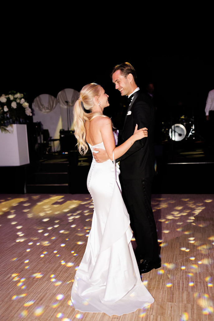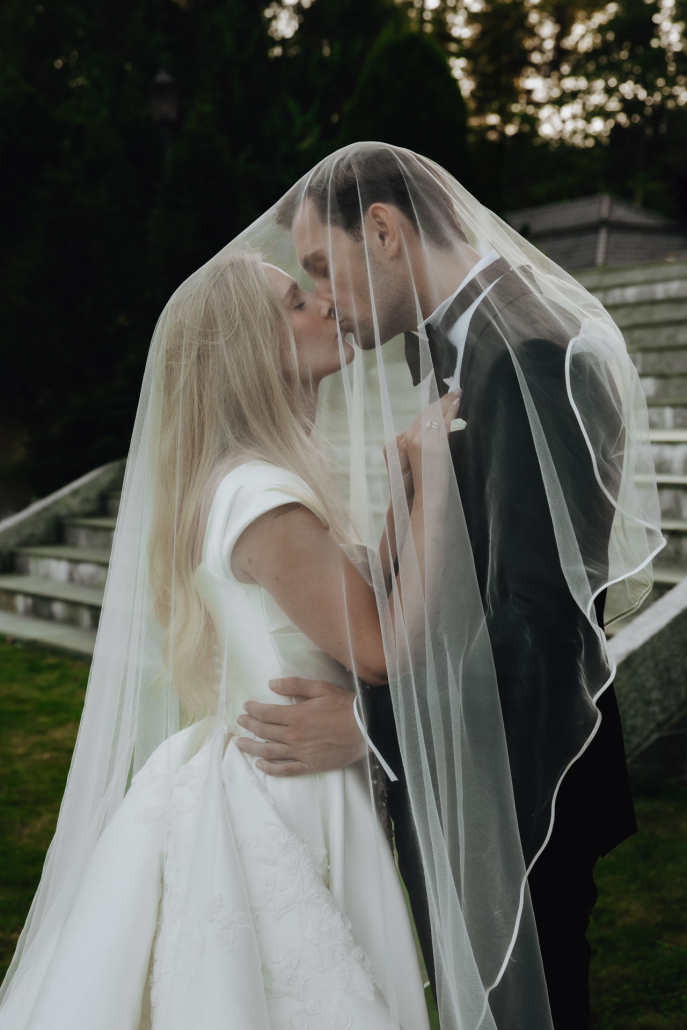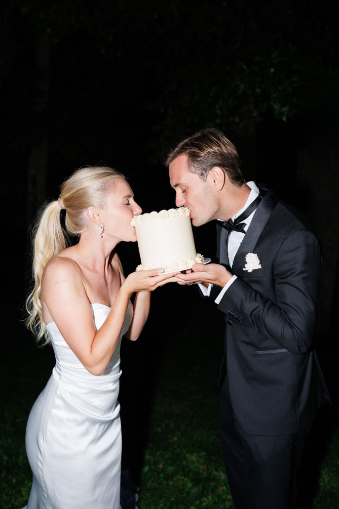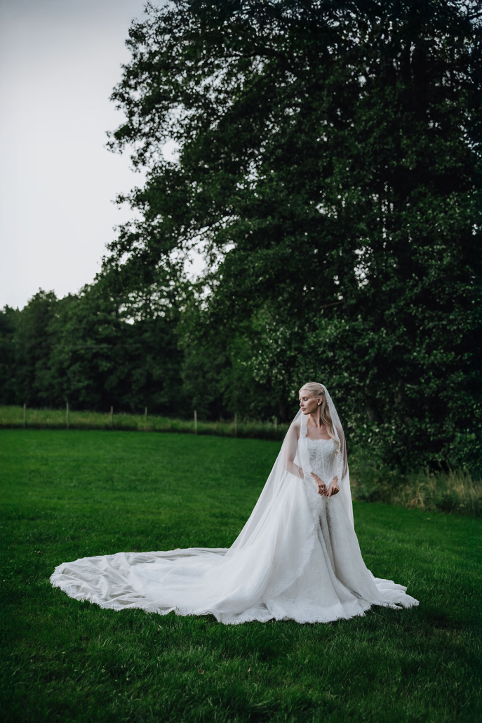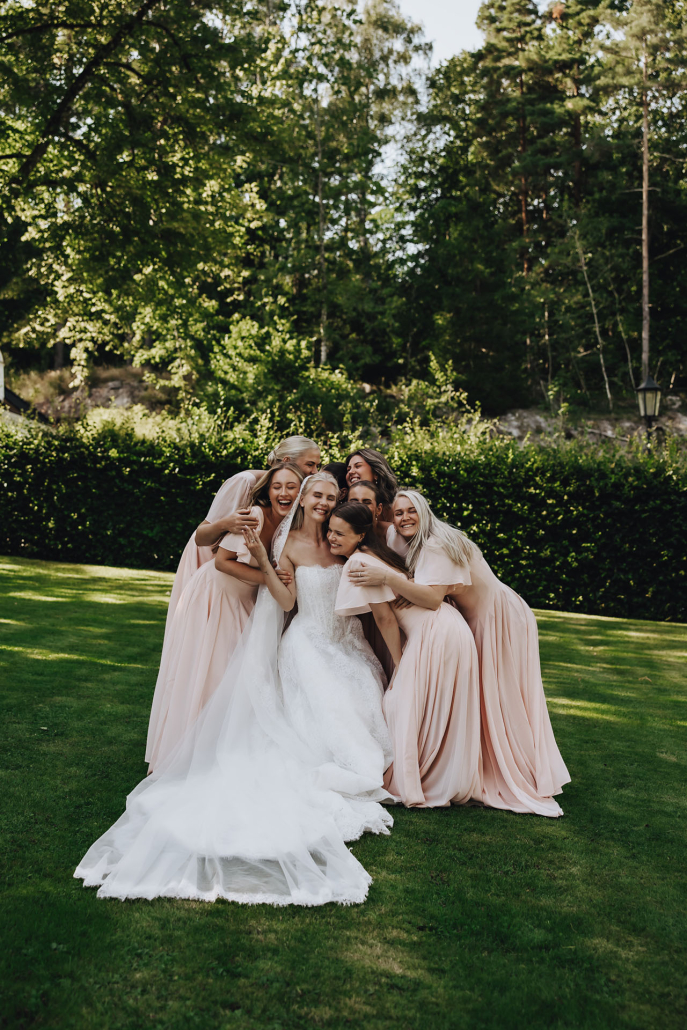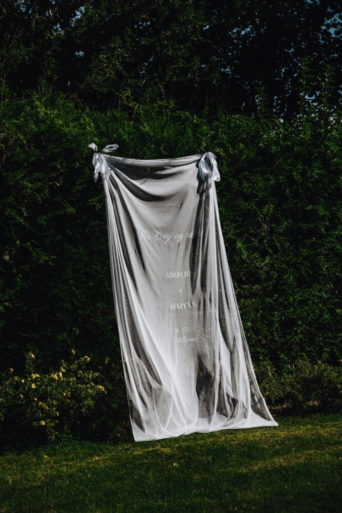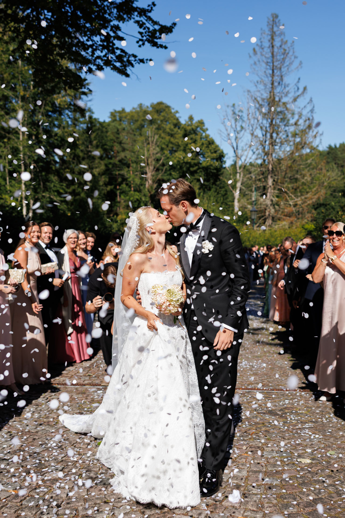 Temaet for bryllupet var klassisk og tidløst, med blomster i hvitt, krem og sarte rosatoner, kombinert med silkebånd og lysestaker. Musikk stod sentralt gjennom hele dagen – fra strykekvartetten i vielsen til levende band og sang under middagen. To toastmastere bød på uforglemmelige innslag, og venner av brudeparet fremførte både sang og dans. «Det ble en drømmekveld,» sier Amalie.