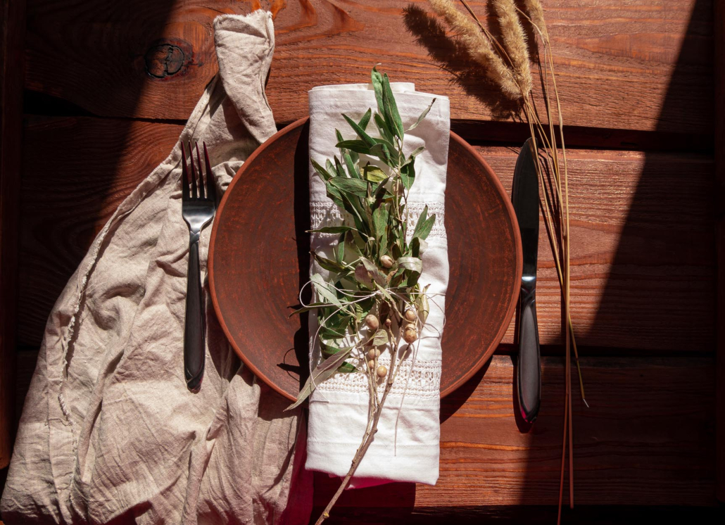 En rustikk borddekking gir en varm og innbydende følelse. Bruk grovere material på dukene som lin eller strie, og dekk bordet med keramikkservise og bestikk i antikk stil. Du kan også bruke trebord som ikke trenger duker, og dekorere med små stubber, villblomster og glasskrukker som vaser. For en ekstra personlig touch kan du legge til håndlagede bordkort i tre eller keramikk.