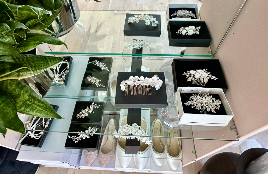 Vi tilbyr også slør og hårpynt fra ulike merker, både matchende til kjolene og fra andre leverandører, i forskjellige prisklasser.