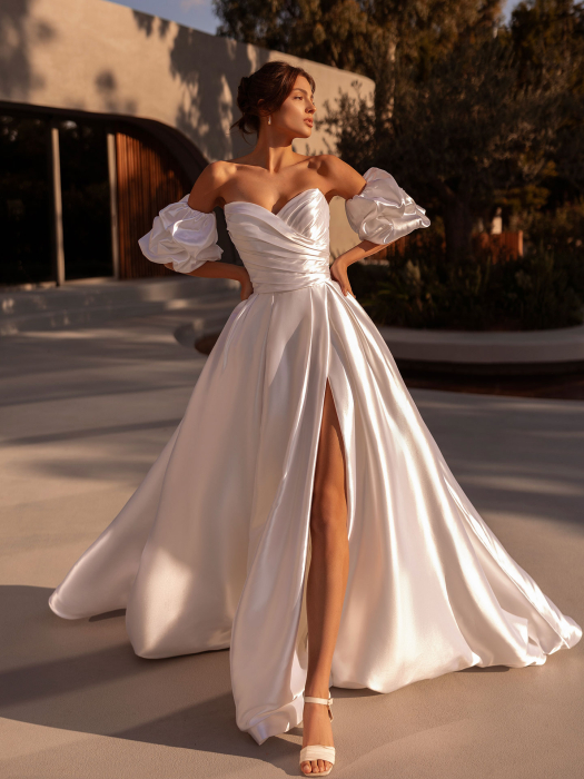 Denne elegante crepekjolen har en raffinert halterneck-utringning med en subtil keyhole-detalj som gir moderne eleganse. Den rene, kroppsnære silhuetten glir mykt over i en lett, flytende avslutning som gir naturlig bevegelse. Minimalistisk, men sofistikert – perfekt for bruder som elsker nedtonet skjønnhet med en moderne vri.