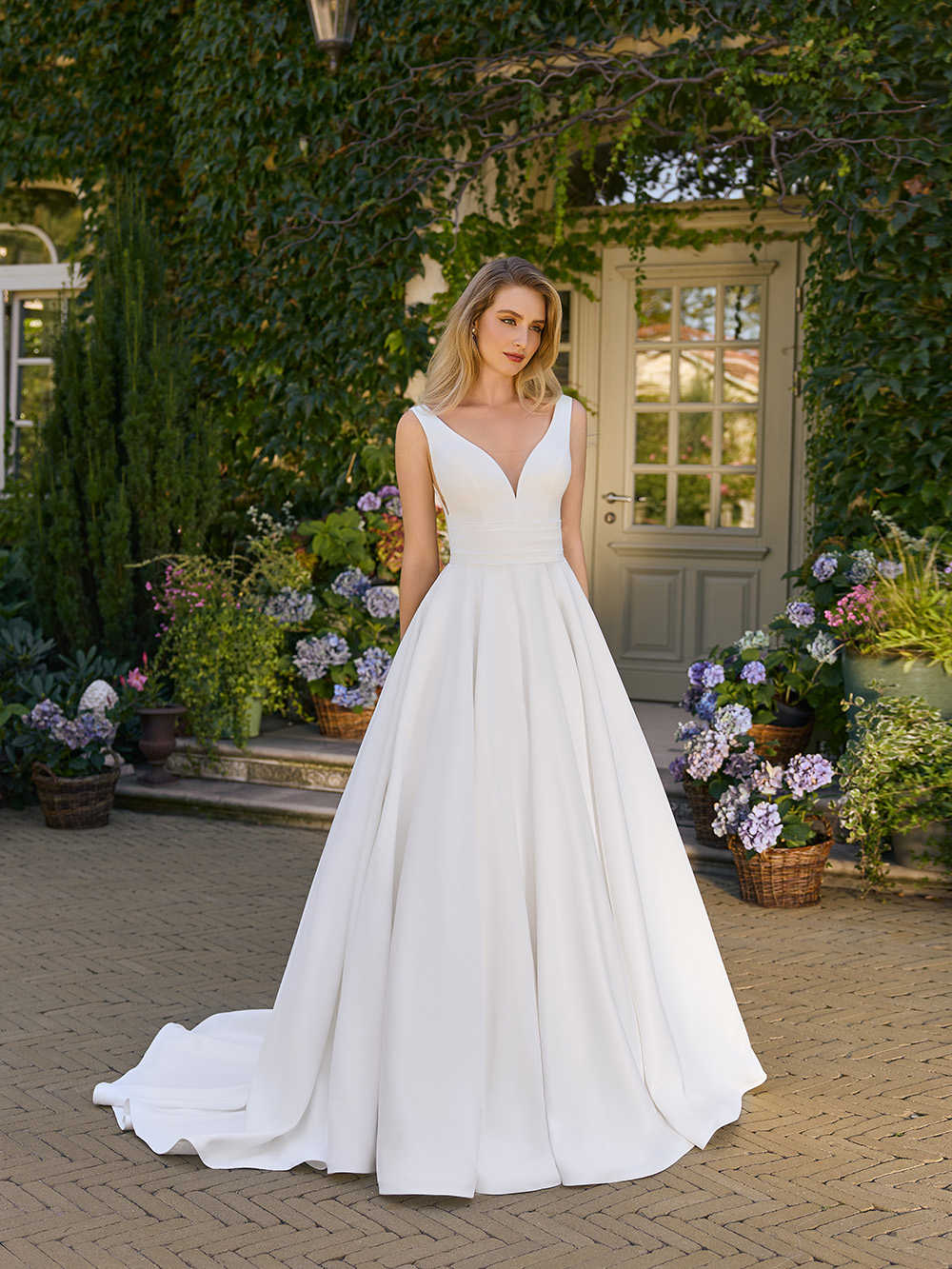 Denne matte satengkjolen har en skulpturert V-utringning og et vakkert drapert bredt midjebånd som fremhever midjen med naturlig eleganse. Det glatte, strukturerte livet glir over i et fullt A-linjeskjørt som skaper en tidløs silhuett med luksuriøs volum. Enkelt, men slående – denne kjolen kombinerer moderne enkelhet med klassisk brudeekspertise.