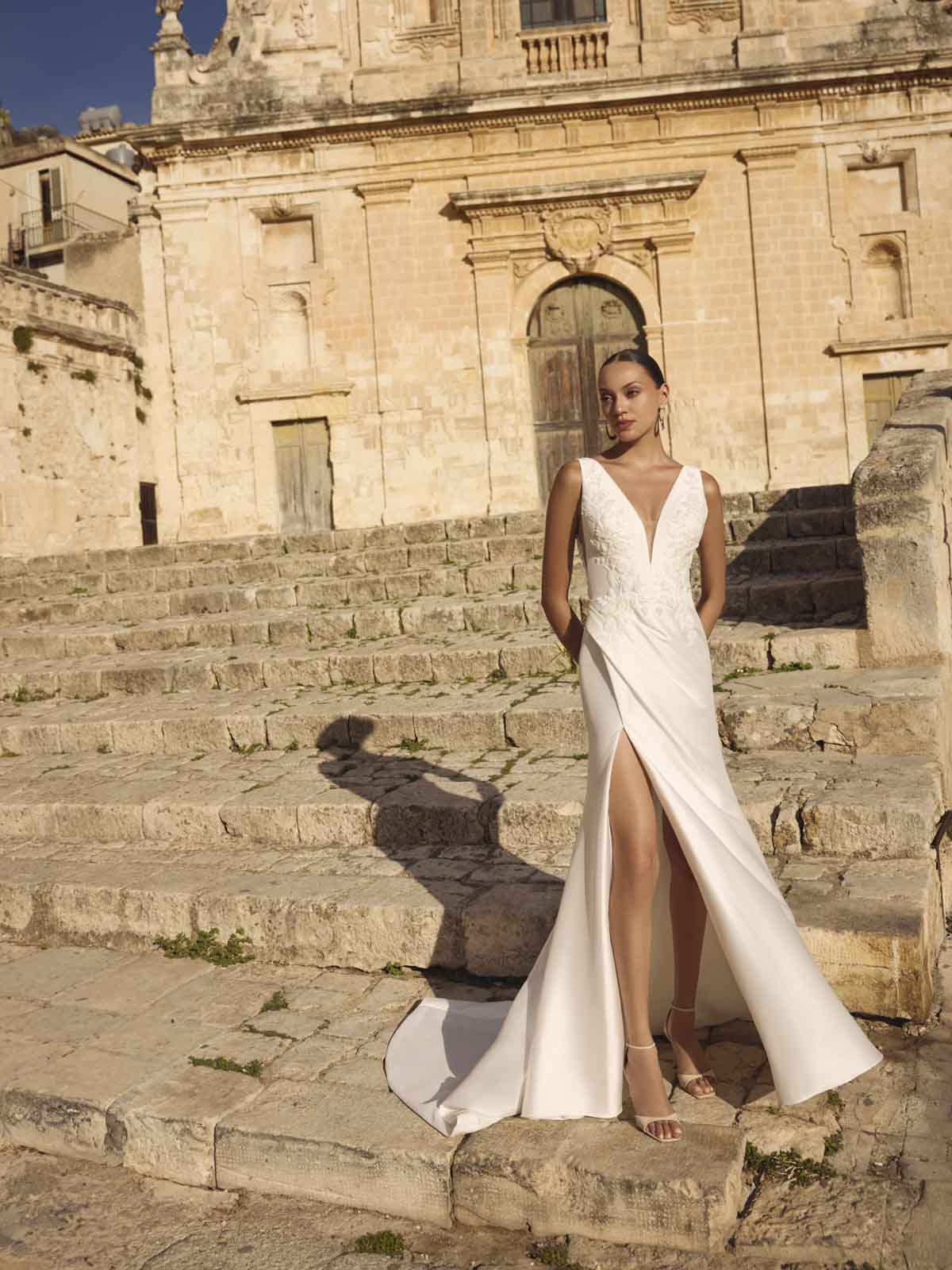 En sofistikert fit-and-flare brudekjole i mikado med V-utringning og delikate blondeapplikasjoner på overdelen. Den lave keyhole-ryggen gir et hint av allure, mens det avtagbare overskjørtet byr på to uttrykk i én kjole – dramatisk og voluminøs til seremonien, og elegant og figurnær til festen. Finnes også i en enklere variant uten overskjørt.