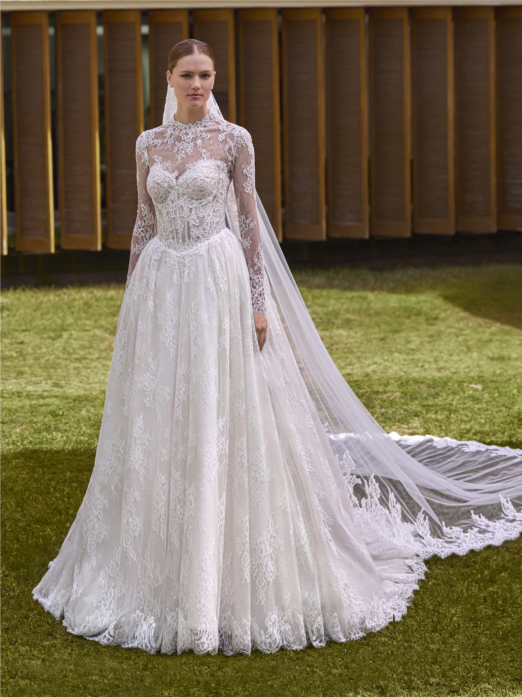 En prinsessekjole med sweetheart-utringning, lett volum i skjørtet og et semi-transparent liv. Kjolen har en avtagbar topp som gir flere uttrykk i én, mens chantilly og blonder skaper en moderne og romantisk silhuett – perfekt for bruden som ønsker både eleganse og fleksibilitet.