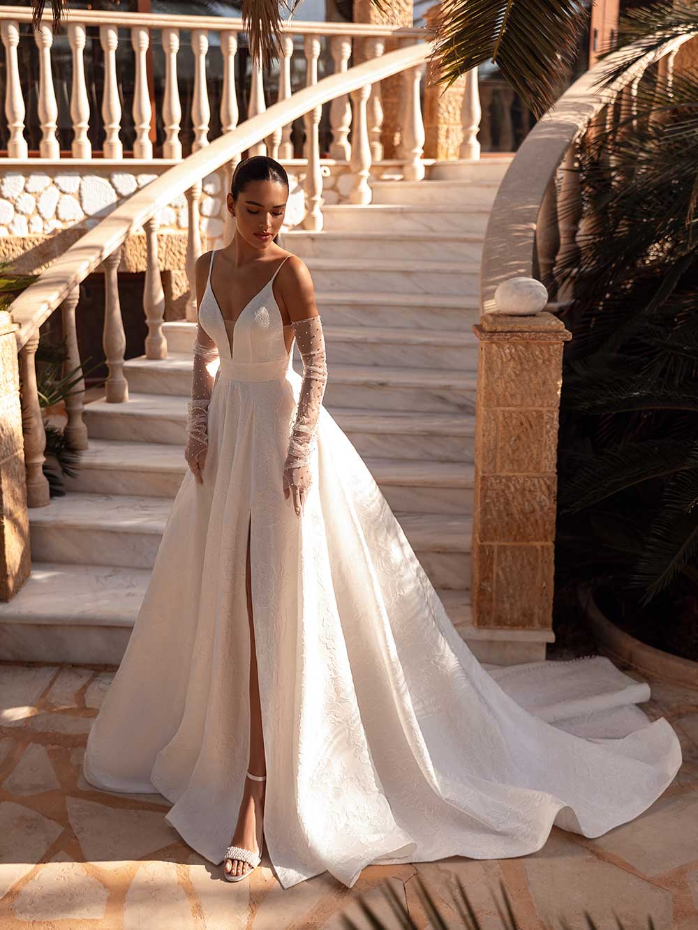 En minimalistisk drøm i brokade med dyp V-utringning og frontsplitt som gir attityde. En perfekt balanse mellom enkelhet og sofistikerte detaljer.