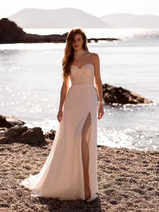 Nedtonet eleganse med rett crepesilhuett og lett materiale. Perlebroderte detaljer rundt hals og ermer gir et romantisk skimmer. For en glamorøs touch kan kjolen matches med cape CA72 (selges separat).