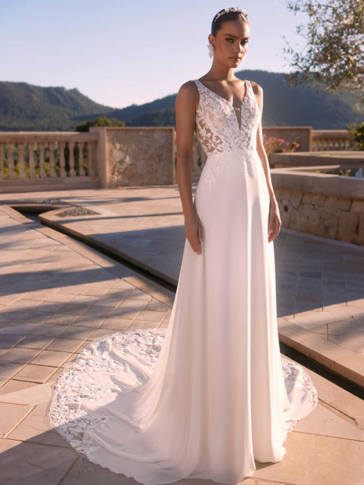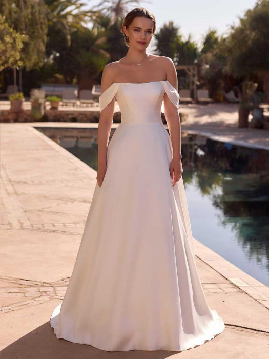 Denne romantiske prinsesse-brudekjolen er laget av høykvalitets stretch-crepe. Den har et vakkert, sveipende slep og korte, nedfalte ermer. Kjolen har åpen rygg og båthals. Den naturlige midjen fremhever silhuetten, og kjolen lukkes med glidelås.