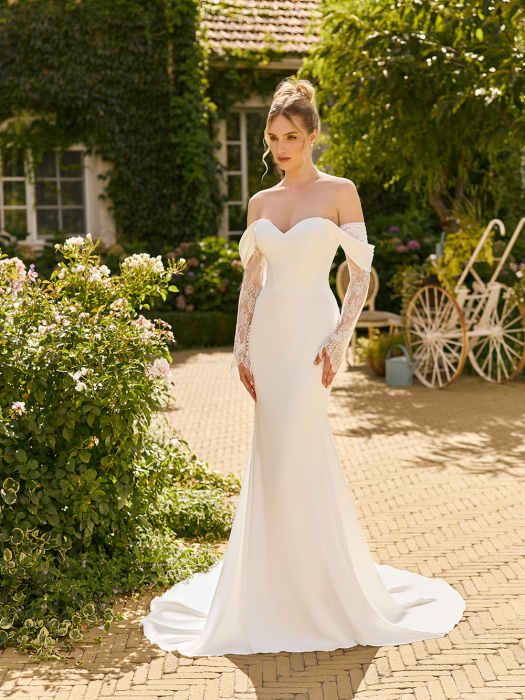 Et moderne mesterverk – denne stroppeløse brudekjolen med strukturert liv og elegant splitt er både chic og uanstrengt. Tilpass looken med et avtagbart jacquardskjørt eller en statement-sløyfe for ekstra drama.