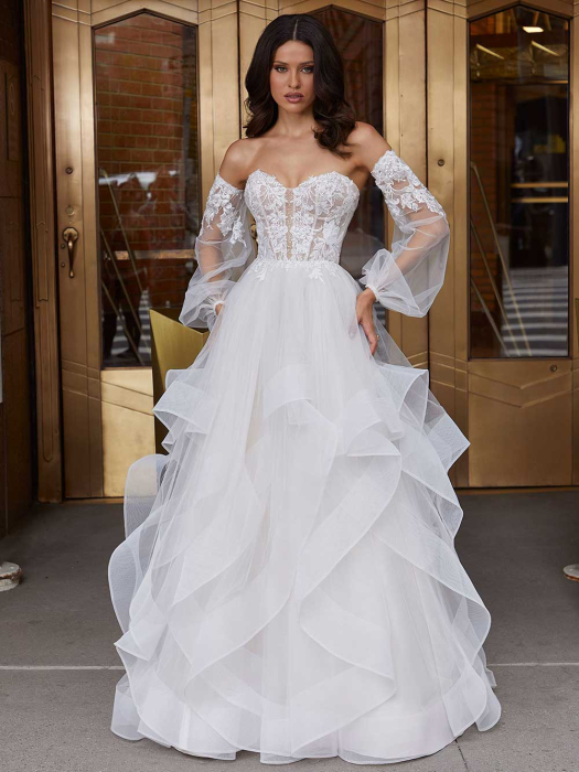 En elegant og tidløs brudekjole i A-linje. Brudekjolen har V-utringning i fint drapert chiffong og ermer med mansjetter. Den draperte overdelen har skinner som gir kjolen struktur og form og fremhever en smal midje. Splitten foran på skjørtet gir denne uskyldige kjolen et mer moderne uttrykk.