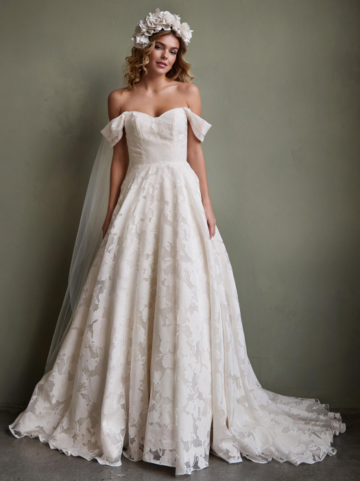Denne fantastiske brudekjolen blander tidløs eleganse med en moderne silhuett. Overdelen har delikate blomsterblonder og en flatterende rund utringning, som gir en romantisk touch som er både klassisk og sofistikert. Det imponerende mikadoskjørtet, innsvinget i midjen, tilfører volum og struktur, og skaper et kongelig utseende som flyter grasiøst fra midjen og ned til gulvet.