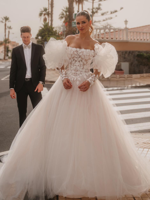 ODETTE fyller atmosfæren med kongelig eleganse. Denne raffinerte brudebrudekjolen har en rund utringning, delikate stropper, en perlebrodert overdel og et imponerende slep som garantert vil fange oppmerksomheten når du går ned midtgangen.