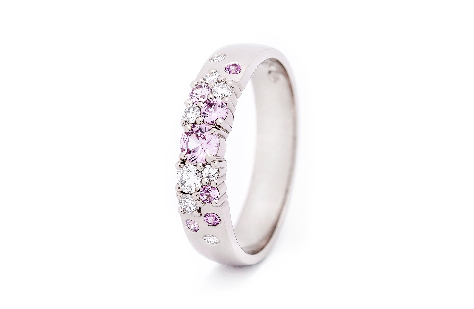 Keto Meadow Spring-kolleksjonens 4 mm brede ring i 18K gull eller 950 platina med hvite diamanter og innslag av rosa safirer har et delikat og blomsterinspirert uttrykk. Ringen har 8 hvite diamanter (totalt 0,17 ct), kvalitet TW/VS, og 7 safirer i pastellrosa nyanser (totalt 0,34 ct).