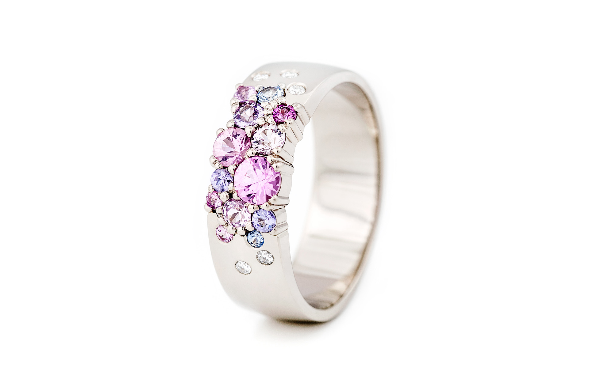 Keto Meadow av gullsmeden Jussi Louesalmi er en nydelig ring som vekker oppmerksomhet! Edelstenene er plassert asymmetrisk. Keto Meadow 6mm-ringen med fargerike safirer og hvite diamanter vant konkurransen Årets Vakreste Ring i Finland i 2017.