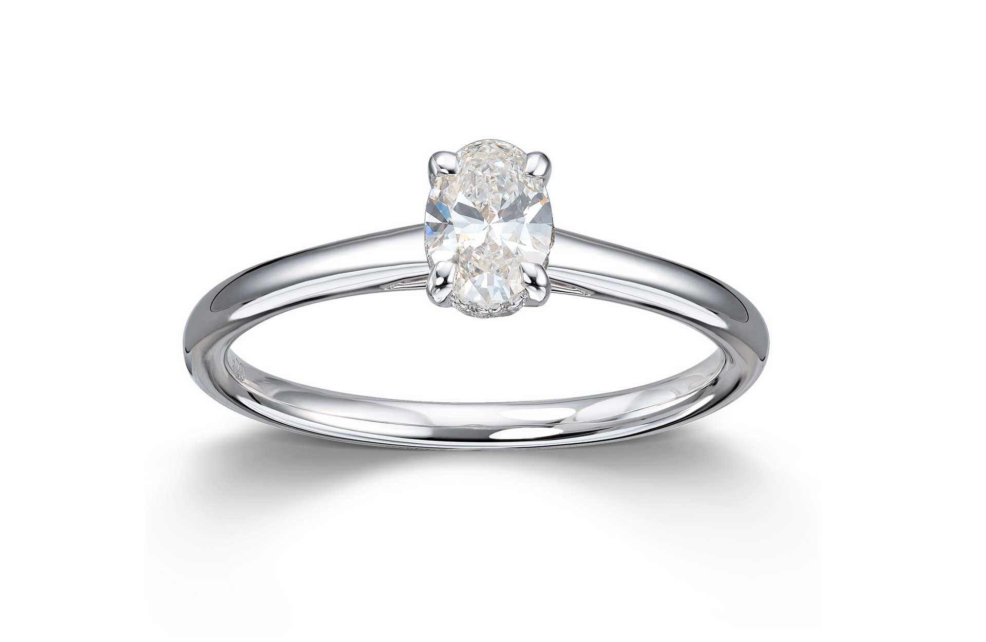 Nydelig ring i hvitt gull med oval diamant og 10 små diamanter i en krans under hovedstenen.