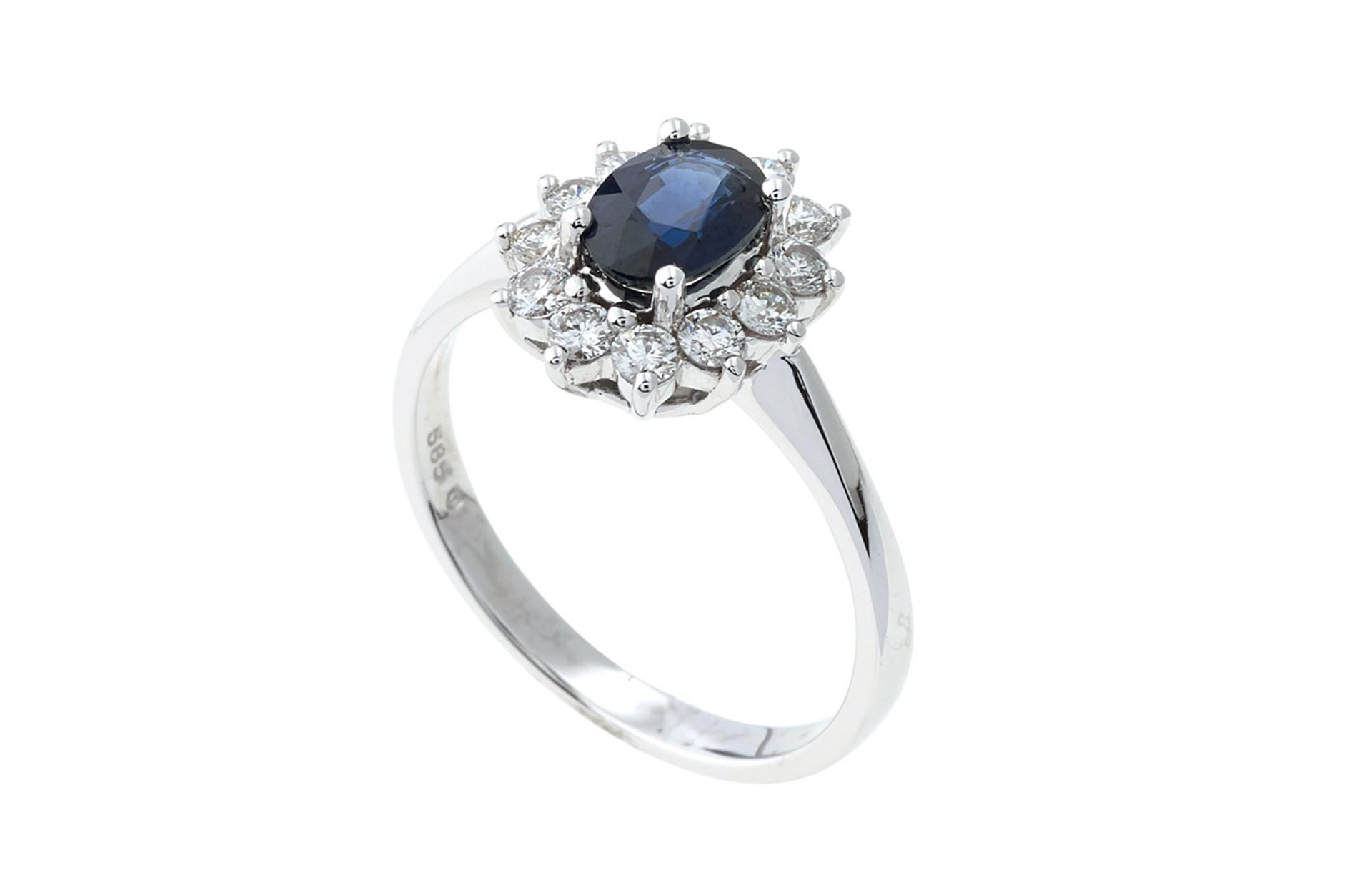 En fantastisk diamantring i hvitt gull med 1,05 carat safir. Rundt safiren er det fattet diamanter i en rosett, totalt 0,53 carat.
