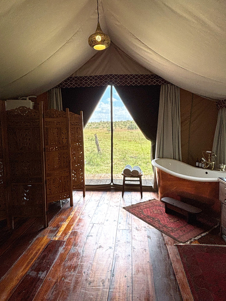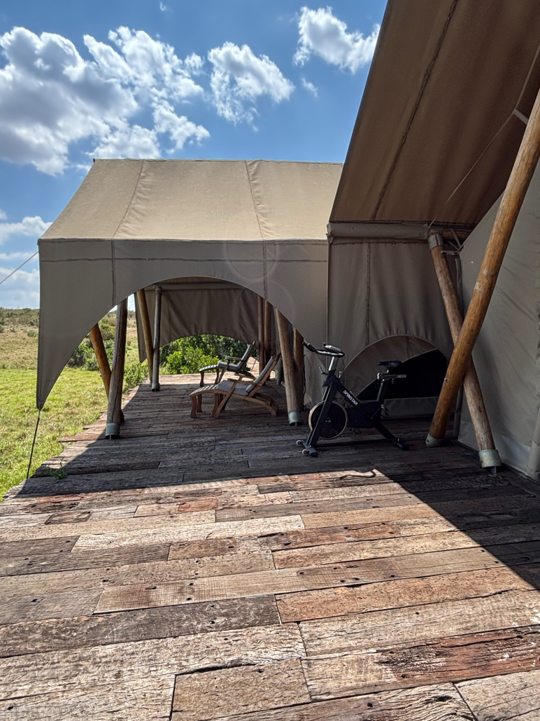 Jeg vil i stedet nyte det luksuriøse teltet og ta en tur på treningssykkelen som står på verandaen. Det blir en varm økt som avsluttes med en svalende dusj. I den åpne dusjen har jeg utsikt over savannen gjennom myggnettingen. Det er ingen i nærheten, og god avstand mellom hvert telt, så det føles befriende å dusje der – nesten utendørs, i pakt med naturen.