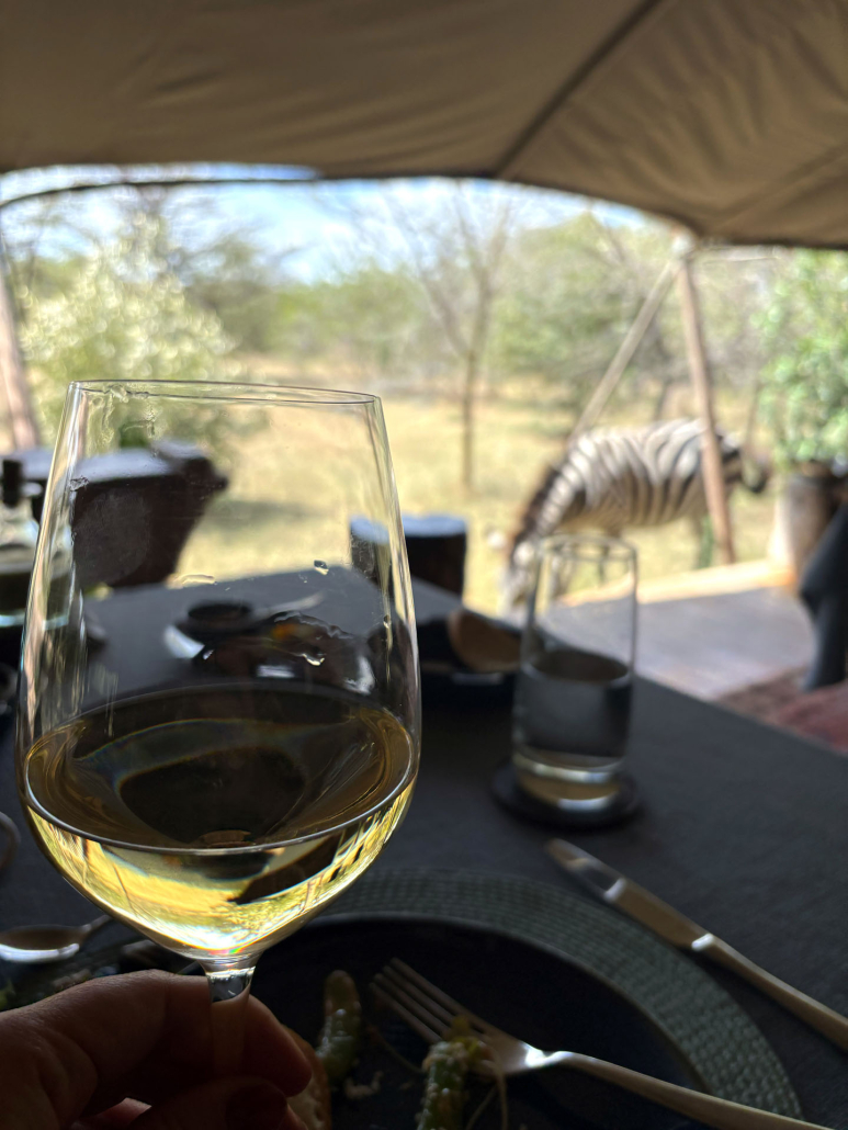 Det serveres en rikelig og sunn lunsj i hovedteltet, som er helt åpent ut mot savannen … og hva møter meg når jeg setter meg ned for å spise? En vaskeekte sebra stiller seg en meter fra terrassen og holder meg med selskap. Er det fordi jeg valgte en topp med sebramønster?