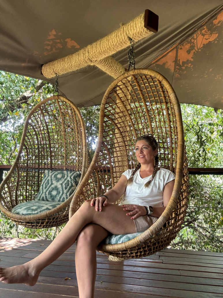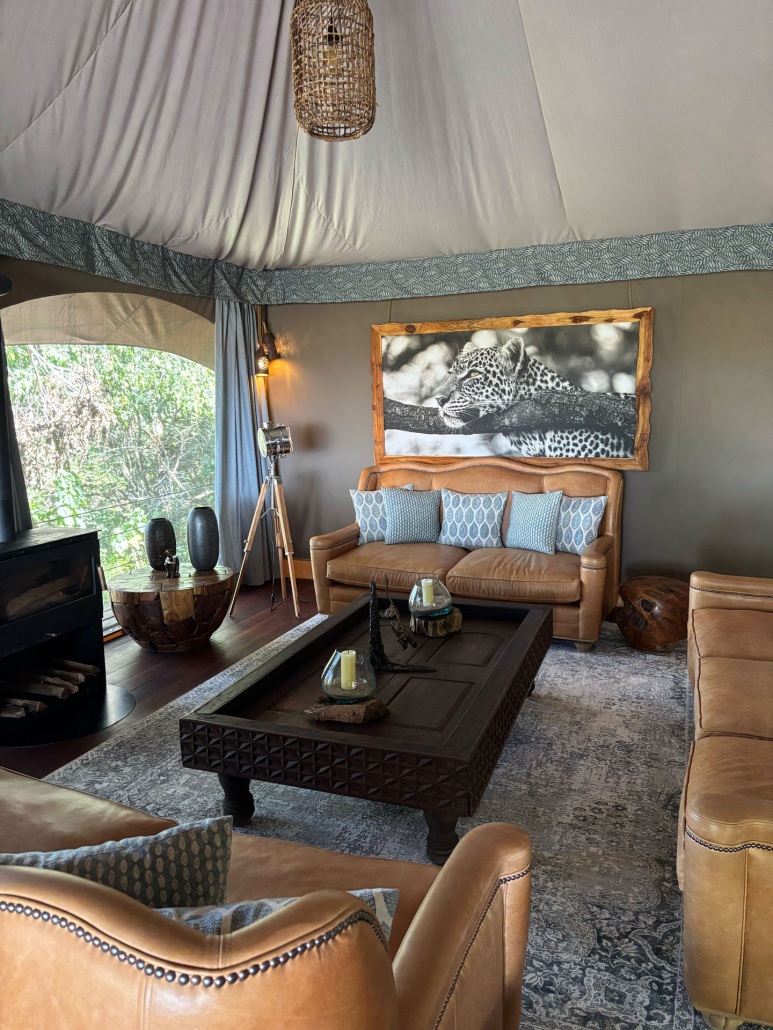 Jeg får bo i bryllupssuiten – telt 1 – mitt eget lille krypinn i ekte safaristil. Det er egentlig mer som en liten leilighet enn som et telt, men med den milde brisen gjennom teltduken, myggnett, mørke tremøbler og en herlig himmelseng. Jeg føler meg som Karen Blixen og skifter antrekk for å matche stilen. Til tross for at jeg bor i telt, er det rask wifi her, en iPad du kan bruke til å kontakte personalet for room service, lademuligheter, dusj og toalett. Alt man trenger, med andre ord.