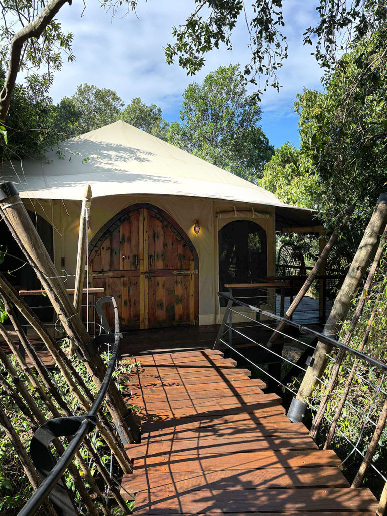 Til slutt kjører vi inn mellom noen busker, og så er vi plutselig på campen. Der møtes vi av hele personalstyrken, som synger og klapper – akkurat som i serien White Lotus. Det er et lite og eksklusivt sted med bare åtte telt totalt, og dermed bare noen få andre gjester.