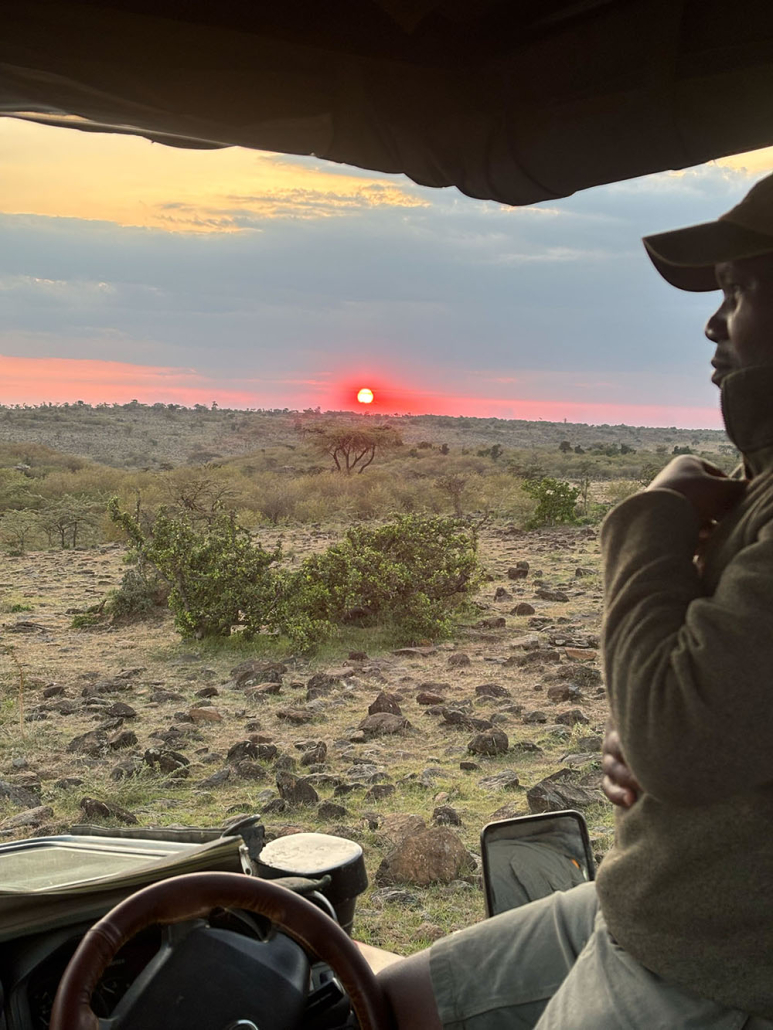 Tidlig neste morgen setter vi oss i den åpne jeepen. Det er mørkt, litt kjølig, og jeg får en termos med te. På setet ligger det en varmeflaske og et teppe i masaifarger, deilig å ha i fanget. Og så får jeg et kamera – et superfint Canon-kamera med 100–400 mm linse, som man kan ta utrolige bilder med og føle seg som en proff-fotograf. Jeg går rett inn i rollen. I soloppgangen kjører vi rundt og observerer dyr, mens Nancy tar imot beskjeder på walkie-talkien om hvor de forskjellige dyrene befinner seg, og om det har skjedd noe spesielt.