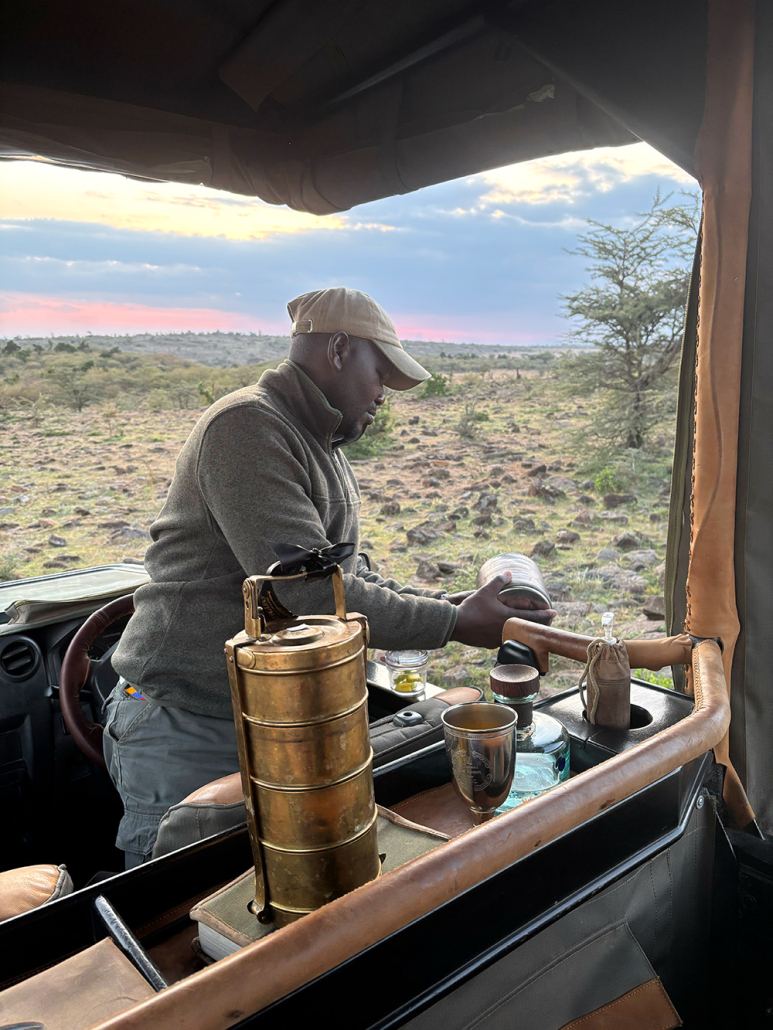 Jeg får hyggelig middagsselskap av campsjefen Douglas, som er en morsom og pratsom fyr og gjerne forteller om Kenya og landets skikker. Jeg lærer mer om masaiene – for eksempel at kyr er et statussymbol. Selv i dag må du eie mange kyr om du skal gifte deg, forteller han. Selv om du ikke er bonde. En annen tradisjon i Kenya er at når en mann varter opp en kvinne, må han legge gaver i en kurv hjemme hos familien hennes. Han får ikke gifte seg med henne før kurven er full – og det kan ta lang tid, for det er nemlig vanlig at andre familiemedlemmer forsyner seg av kurven.