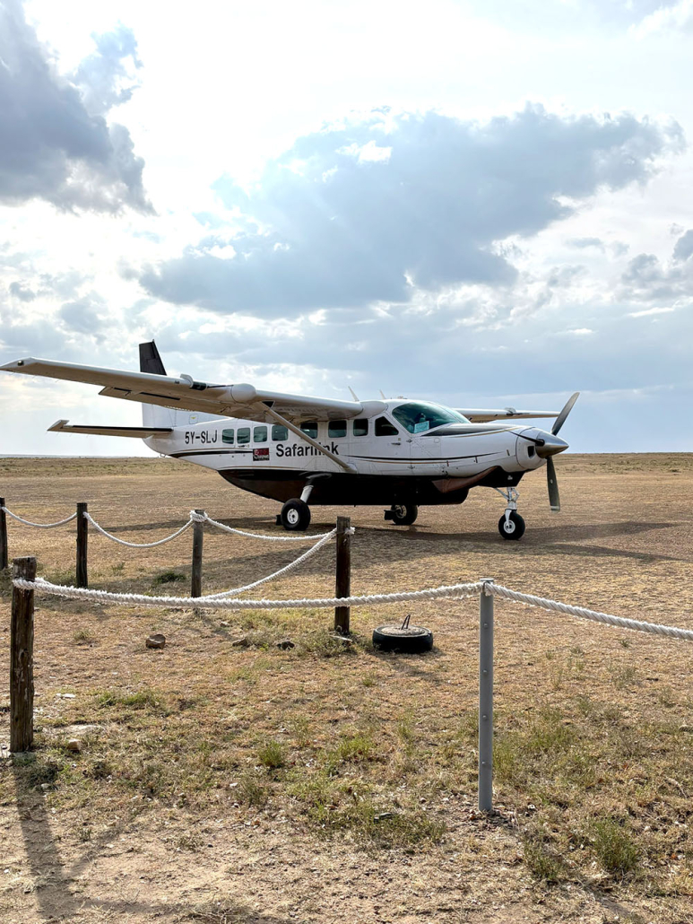 Flyturen går fra Oslo til Doha i Qatar, og derfra videre til Nairobi. Herfra er det et småfly som skal ta meg ut på savannen. Lite, tilsynelatende minst 40 år gammelt, og med en veldig autentisk safarilook. Vi flyr over storslåtte vidder – tørr savanne, men også mye grønn vegetasjon og elver som snirkler seg gjennom terrenget. Nå begynner det, tenker jeg.