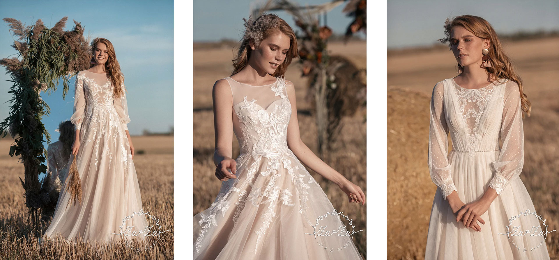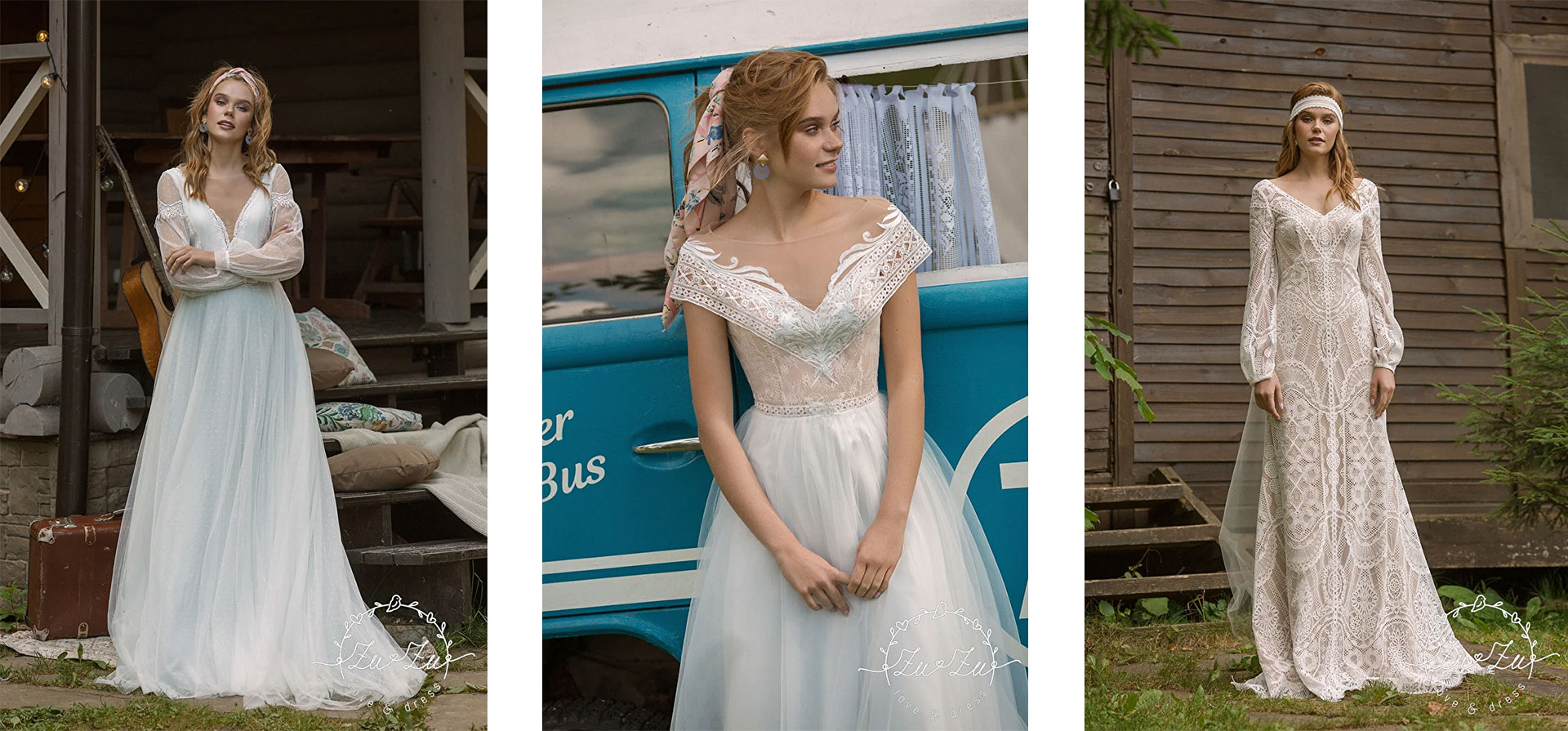 Det russiske merket zu-zu vet hvordan man uttrykker den bohemske følelsen. Tør du å maksimere den bohemske stilen og virkelig kjøre hippiebryllup fullt ut, ja, da er dette kanskje merket for deg. Kjolene stikker ut på en ny måte, her ser vi en blanding av vintagevibber, 60-tallsreferanser og folklore med herlige duse farger.