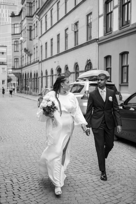 Alice, @photobylaiho på Instagram. Hun er fantastisk! Ikke bare tar hun de vakreste bildene, hun er også bare så fin og trygg å ha med seg på en så spesiell dag. Vi er så utrolig fornøyde og glade for at hun var en del av dagen og fanget den på en så vakker og ekte måte. Vi startet dagen med First Look, og deretter dro vi inn til Gamla Väster for å fotografere der. Jeg synes det er så fint med bryllupsbilder som er tatt i slike omgivelser. Så dro vi sammen til vielsen. Der tok Alice fantastiske bilder og fanget alle viktige øyeblikk. Det var så fint å se tilbake på bildene av familie og venner, siden det ikke er noe man ser så mye av når man er der. Under festen dro hun oss til side for noen bilder i den gyldne timen, og det er vi glade for!!
