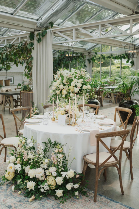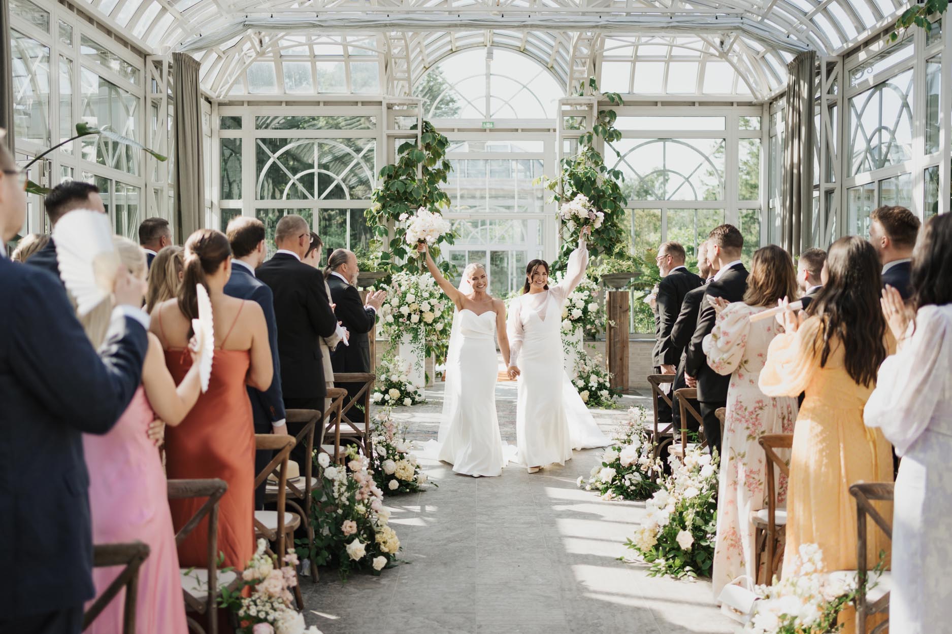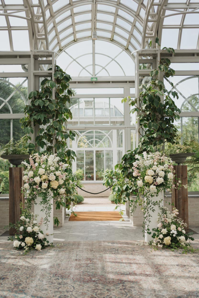 Vielsesseremonien skjedde i Victoriahuset på Norrviken, som er et nydelig og elegant drivhus med vakker beplantning i romantiske omgivelser. Her er det også glassvegger og tak, som slapp inn masse naturlig lys og solen skinte også inn. De grønne store plantene komplimenterte blomsterdekorasjonene paret hadde valgt ut, og paletten sto perfekt i stil med deres visjon.
