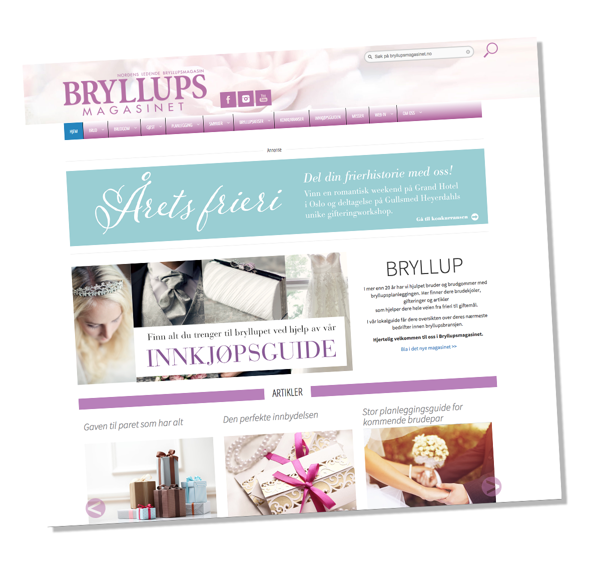Sammen med vår bryllupsweb er vi en viktig inspirasjons- og informasjonskilde for blivende brudepar. I tillegg til produkter som er retter direkte til sluttkonsumenten står vi også bak bransjemagasinet Nordic Bridal, Nordens eneste magasin for bryllupsmote. Nordic Bridal distribueres til over 1300 butikker og forhandlere av bryllupsantrekk og accessoirer i hele Norden.