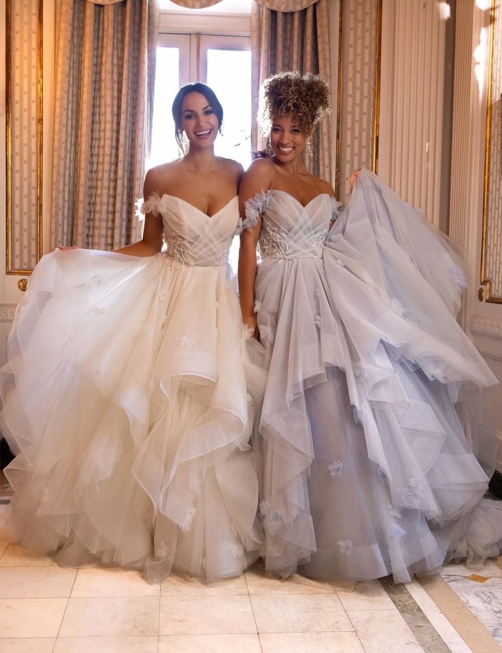 Effie er en vakker, glamorøs ballkjole med vakre draperinger. En eventyrlig brudekjole med volangskjørt, tredimensjonale blomster og krystaller. Kjolen har avtakbare skulderstropper som gir to looks i én.