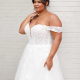 Romantisk brudekjole med offshoulder ermer og vakre, naturinspirerte blonder som stømmer nedover i skjørtet. Kjolen finner du hos Brudehuset Tromsø.