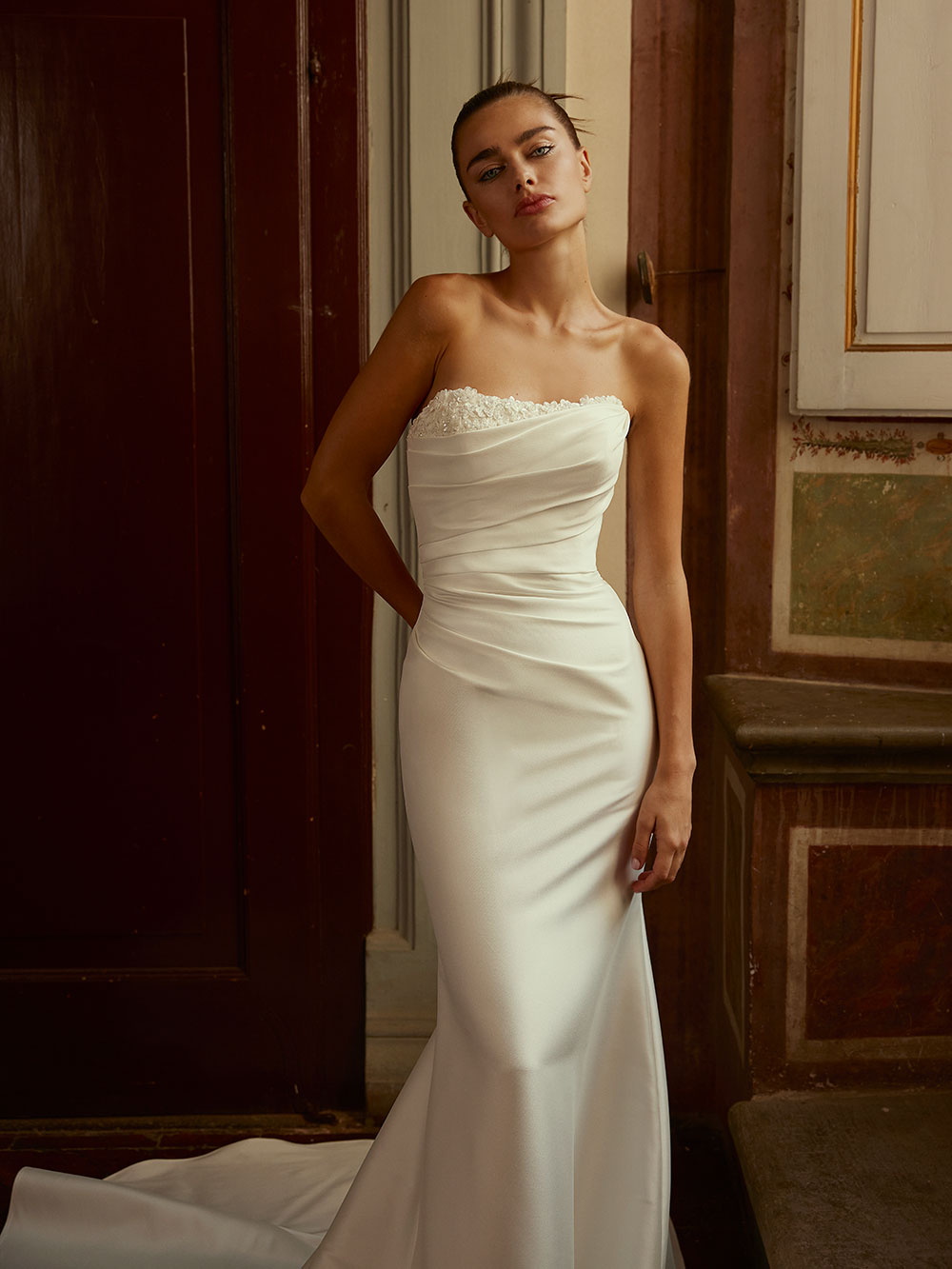 En sofistikert fit-and-flare brudekjole i mikado med V-utringning og delikate blondeapplikasjoner på overdelen. Den lave keyhole-ryggen gir et hint av allure, mens det avtagbare overskjørtet byr på to uttrykk i én kjole – dramatisk og voluminøs til seremonien, og elegant og figurnær til festen. Finnes også i en enklere variant uten overskjørt.