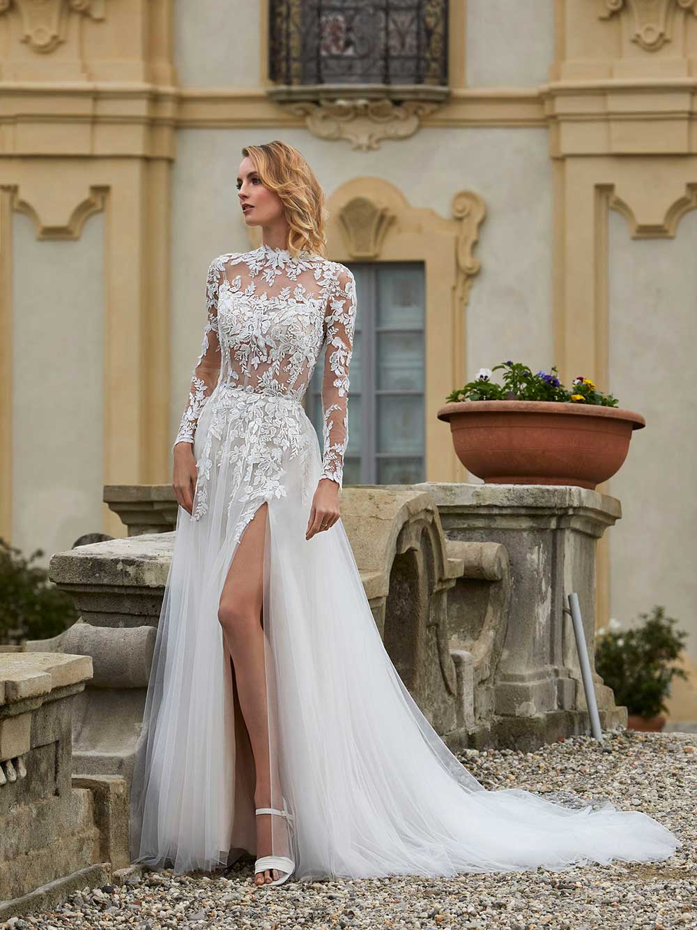 En drømmekjole i blomstrete blonde. Livet i brodert organza kombineres med off shoulder-utringning, matchende ermer (SL95 og SL96, selges separat) og et voluminøst ballkjørt. Fullfør looken med det matchende blondehalskjedet (COL12, selges separat) for en eventyrlig helhet.