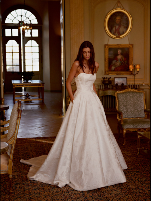 Joelle – A-linjeformet brudekjole i Alençon-blonder med firkantet utringning. Kjolen har en gjennomsiktig korsettliv med synlig snøring og en Basque-midje. Den har firkantet utringning foran og på ryggen, avsluttet med knapper ned til slutten av midjen. Scalloped-blonder avslutter brudekjolens fald og slep i kapell-lengde. Versjon med fôret overdel tilgjengelig som 88423LND.