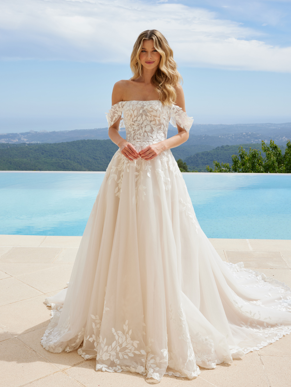 Sofistikert og elegant A-linje-modell designet for å fremheve figuren. Dekorert med intrikate broderte blomsterblonder, har brudekjolen en søt, men iøynefallende estetikk som fanger blikket. Mykt tyll og chiffonfôr gir bevegelse til det vakre fulle skjørtet og slepet.